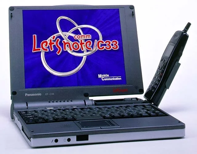 На первом фото ноутбуку недостаёт детали. Туда, где по логике должна быть вторая петля, вставлялся либо модуль для мобильного телефона (на втором фото), либо, если верить интернету, для видеокамеры.