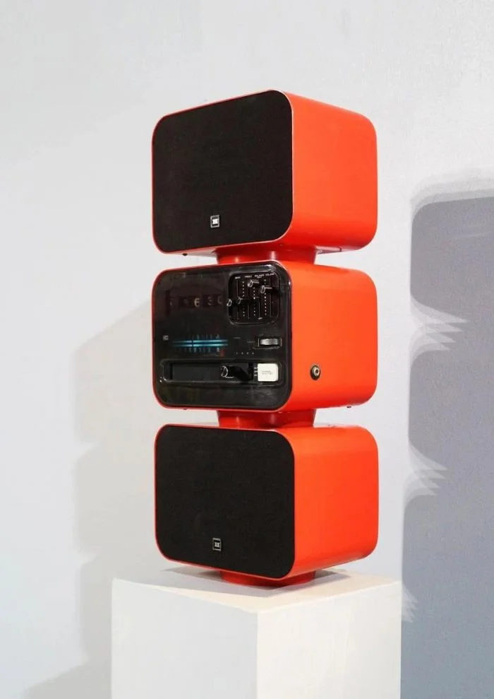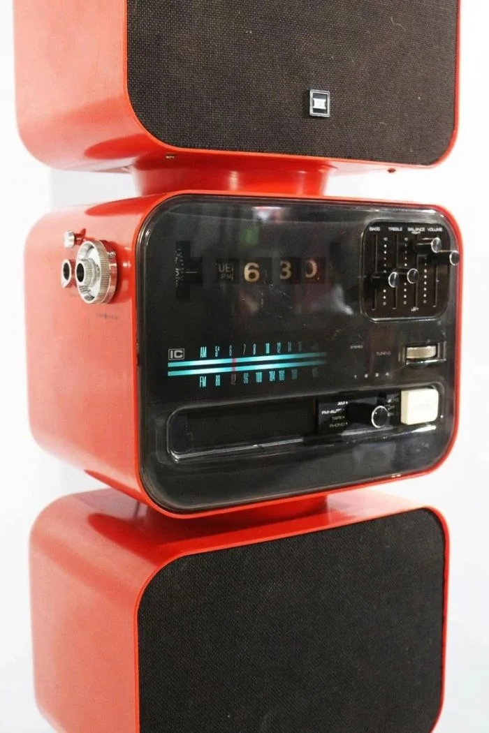 Выпущенная в 70-х годах японская аудиосистема, судя по наличию 8-дорожечного слота, дополнена AM/FM радиоприемником, цифровыми часами со звуковым будильником (с переворачивающимися цифрами) и двумя отдельными динамиками.