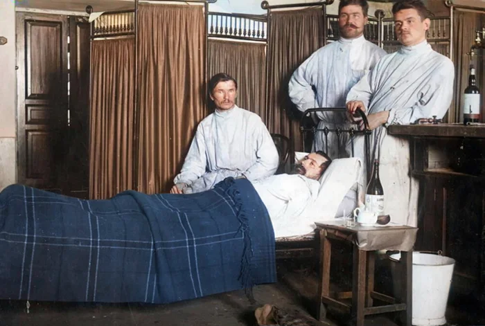 Выздоровевший после заражения чумой врач Л. Падлевский с коллегами, 1907 год.