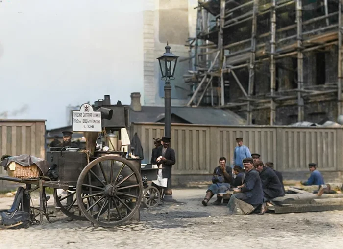 Рабочие строители за обедом у выездной кухни городской санитарной комиссии, 1908-1910 год.