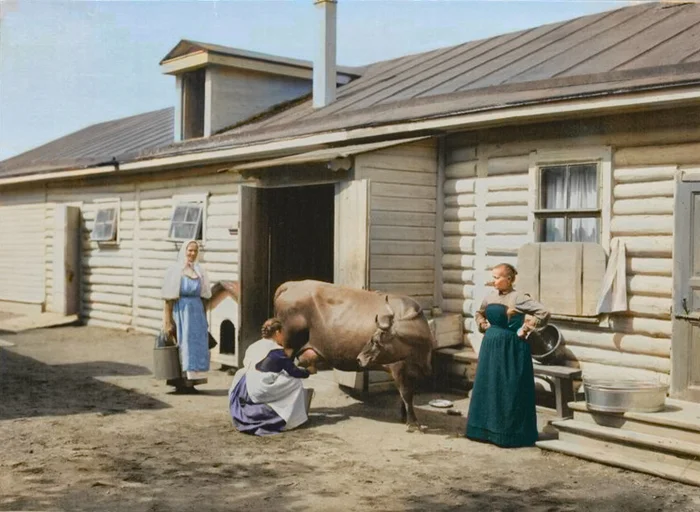 Мариинское училище глухонемых в деревне Мурзинка. Дойка коровы у коровника, 1902-1907 год.