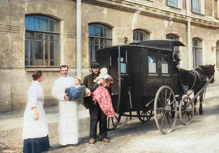 Санитары выносят из санитарной кареты детей, больных холерой, 1908 год.