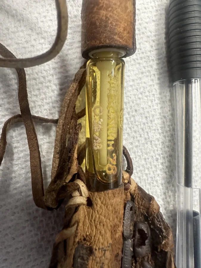 12. Нашёл на затонувшем корабле, кто-нибудь знает, что это такое? Маленький пузырёк с прозрачной жидкостью внутри! В кожаном мешочке на шнурке