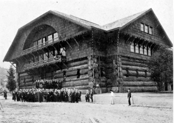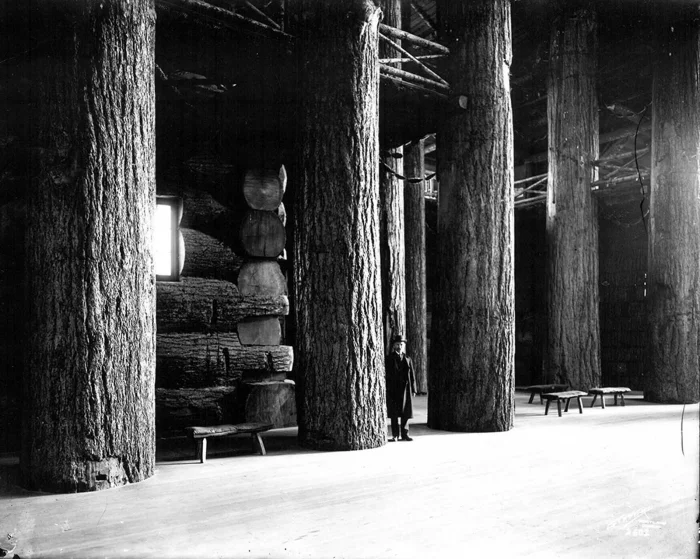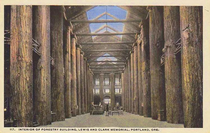 Большинство массивных бревен, использованных для строительства, были из старых деревьев, произраставших в округе Колумбия, штат Орегон, некоторые из них имели диаметр до 2 метров. Внутри здания лесного хозяйства располагались колоннады из 54 крупных неотёсанных стволов пихты, которые поддерживали 2-этажный центральный неф.
