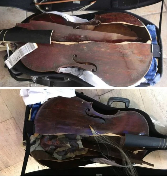 Посмотрите, в каком состоянии был возвращен мой инструмент 17-го века. После того, как меня уверяли, что его перенесут на борт самолета вручную, он выглядит так, словно его переехал автомобиль.