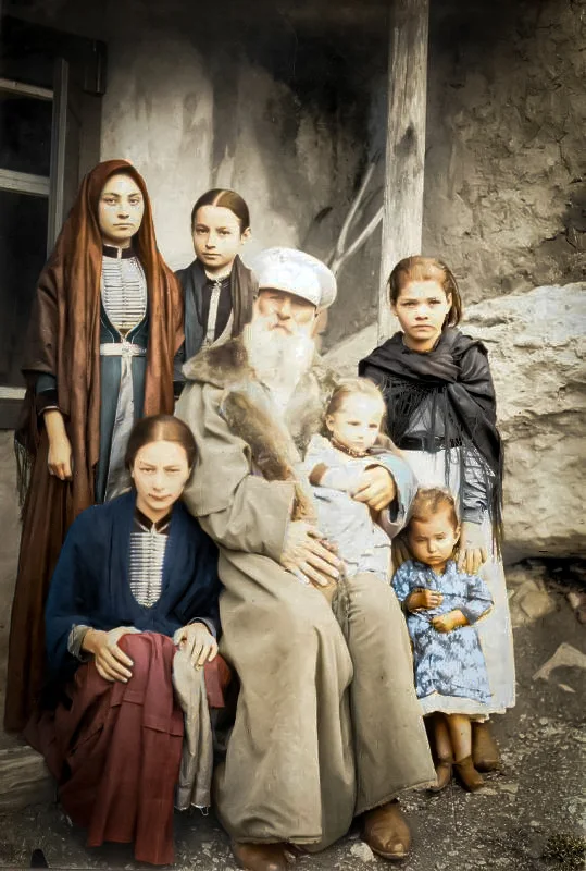 Отставной поручик милиции Мисирби Гутиев с внучками, 1898 год.