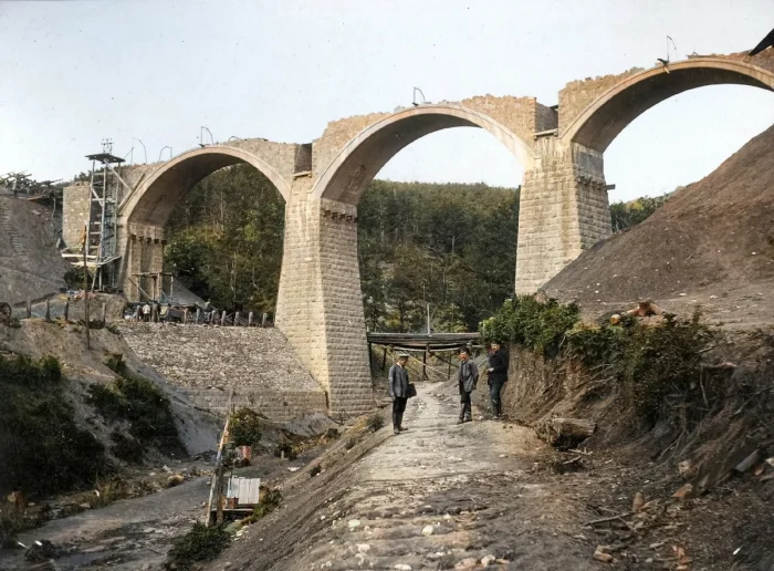 Постройка моста-виадука через реку Елик на 195-й версте пути.