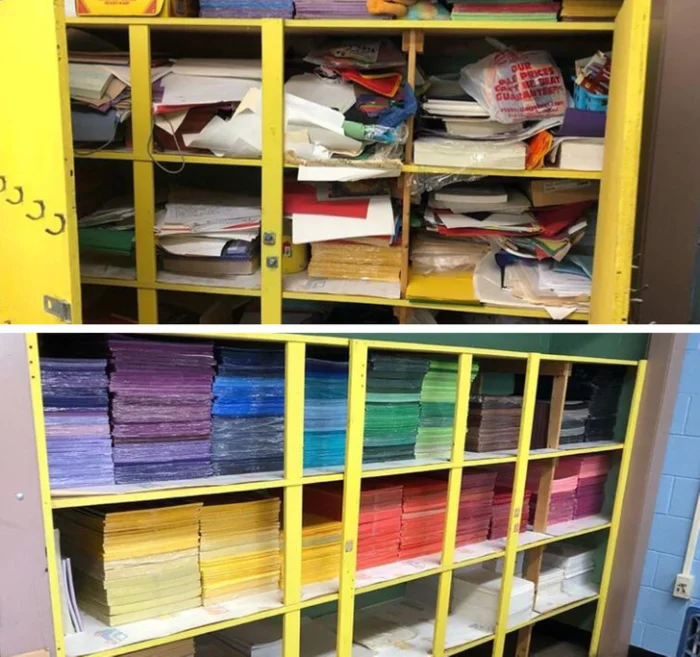 «Работаю учителем. Устроилась в новую школу. Посмотрите, как преобразился мой шкаф, который курировал предыдущий преподаватель»