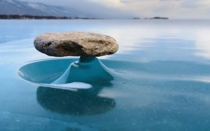 Такое уникальное явление можно наблюдать на Байкале зимой. В солнечную погоду камни на замерзшем озере нагреваются и растапливают лед под собой. Ночью лед снова затвердевает, образуя «подставку» для камня.