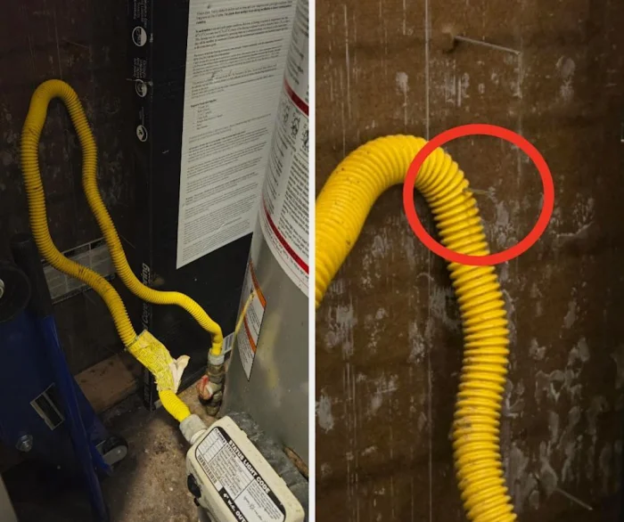 18. И, наконец, домовладелец, который ВБИЛ ГВОЗДЬ В ГАЗОПРОВОД, чтобы прикрепить его к стене (?!?!), фактически гарантируя утечку газа в жилом помещении этого бедного арендатора: