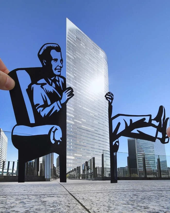 Художник предлагает зрителям взглянуть на мир с новой перспективы, создавая бумажные фигуры, которые гармонично вписываются в окружающие ландшафты. Иными словами, он преобразует привычное в нечто необычное.