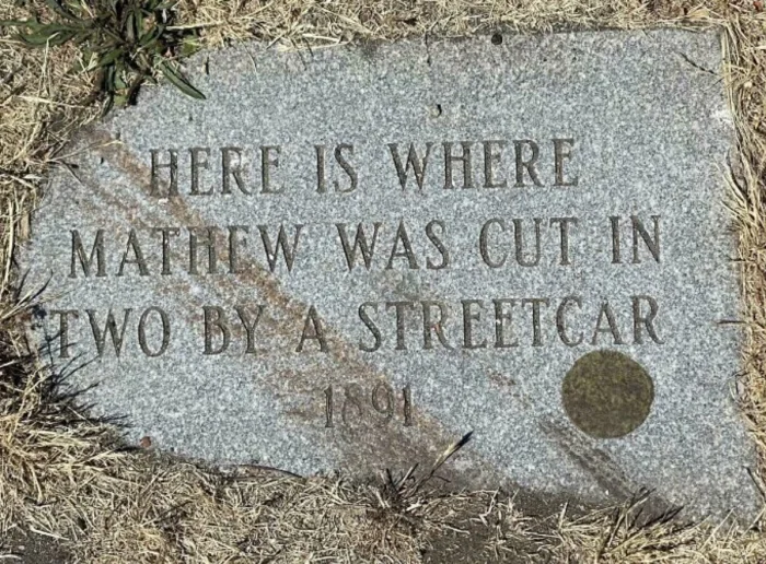 На табличке написано: «На этом месте в 1891 году Мэтью был разрезан напополам трамваем»