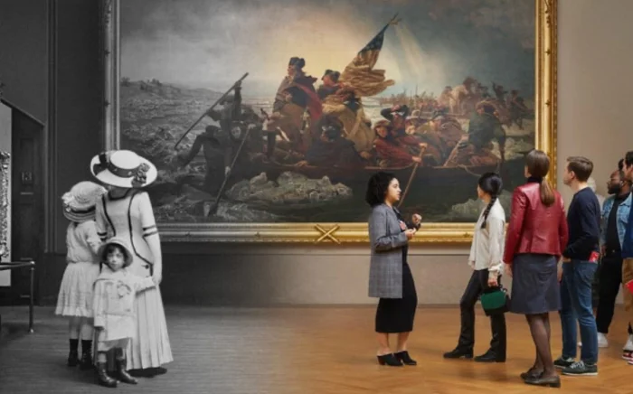 Автор мастерски соединил два снимка, оба из Метрополитен-музея. Слева мы видим посетителей в 1910 году, а справа — в нашем тысячелетии.
