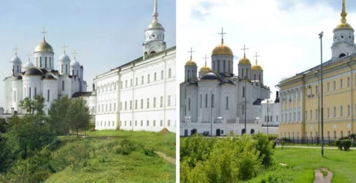 Город Владимир в России почти не изменился с 1911 года, что видно на этих фотографиях — старая находится слева. Различие можно заметить лишь по современному столбу.