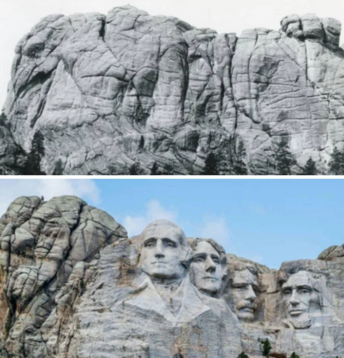 Легендарная гора Рашмор. Вверху фотография 1922 года, а снизу — сделанная в 2018 году.