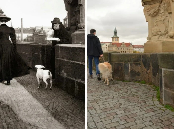 Замечательные фотографии Карлова моста в Праге. Собаки позируют, а вот старика не хватает. Верхняя фотография сделана в самом начале ХХ века.