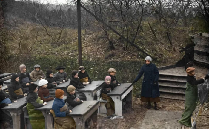Школа под открытым небом на морозе. Нидерланды, 1918 год.