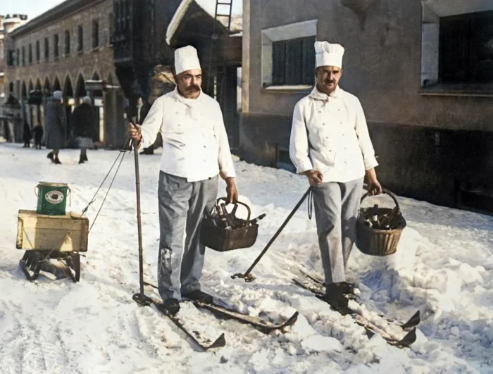 Два повара на лыжах отправляются за продуктами. Санкт-Мориц, Швейцария, 1930 год.
