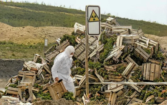 Рабочий в защитном комбинезоне на свалке в Берлине, где после аварии на Чернобыльской АЭС хранились зараженные овощи. 9 мая 1986 года.