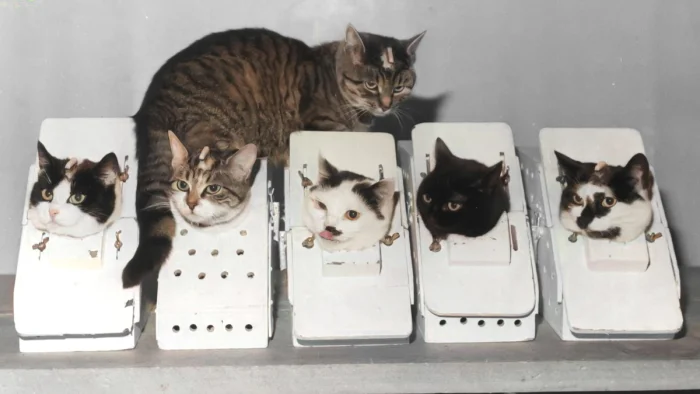 Кошки проходят специальную тренировочную программу в французской лаборатории космических исследований для подготовки к полету. Париж, 1963 год.