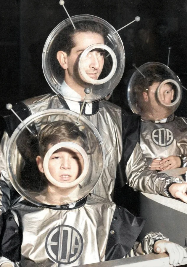 Бывший король Югославии Петр II и его сын в футуристических скафандрах, Англия, 1950 год.