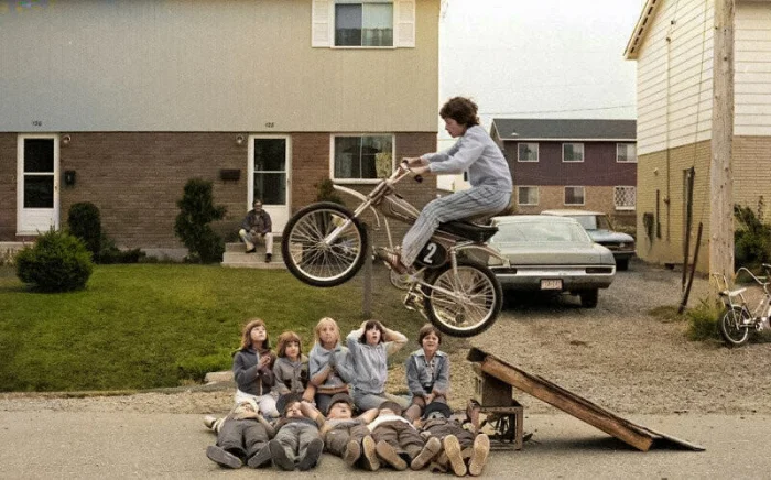 Подросток на мопеде прыгает через своих друзей, США, 1972 год.