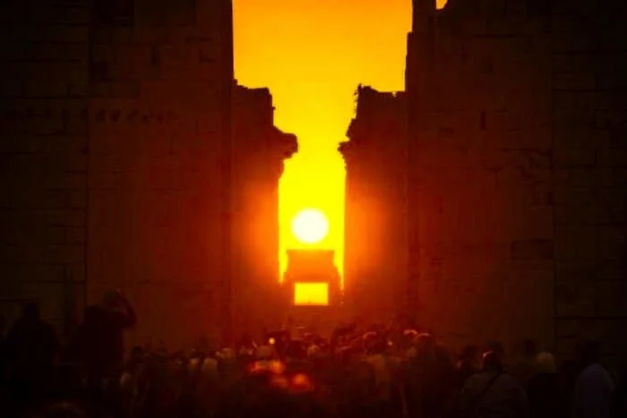 Зимнее солнцестояние, которое происходит 21 декабря, характеризуется уникальными солнечными выравниваниями, особенно в храме Карнака, где восход солнца совпадает с осью храма, освещая святилище Амон-Ра, которое олицетворяет солнце в его ежедневном пути по небу, представляя жизнь и цикл дня и ночи.