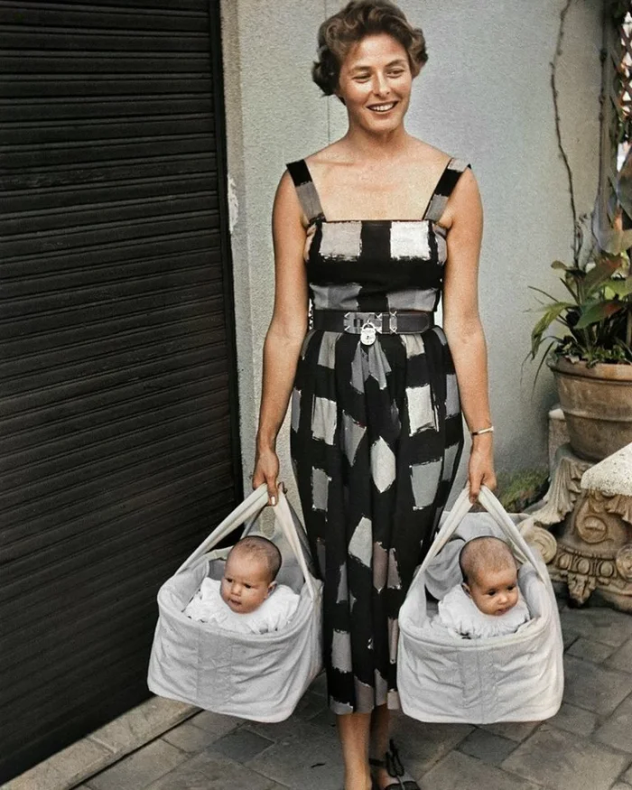 Счастливая мать Ингрид Бергман с дочерями-близнецами: Изоттой и Изабеллой Росселлини, 1952 год.