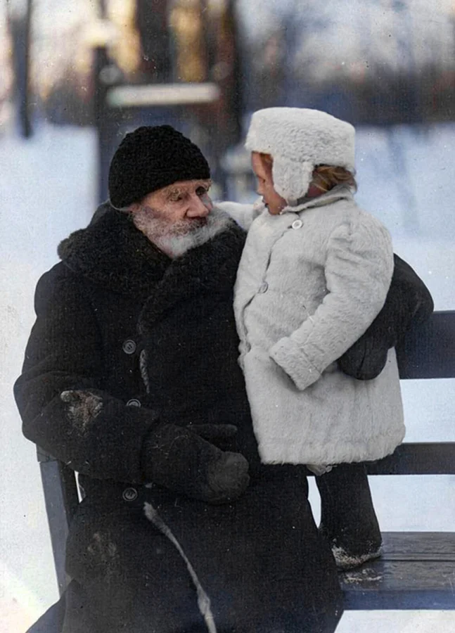 Лев Толстой с внучкой Таней Сухотиной. Тульская губерния, деревня Ясная Поляна, 1908 год.