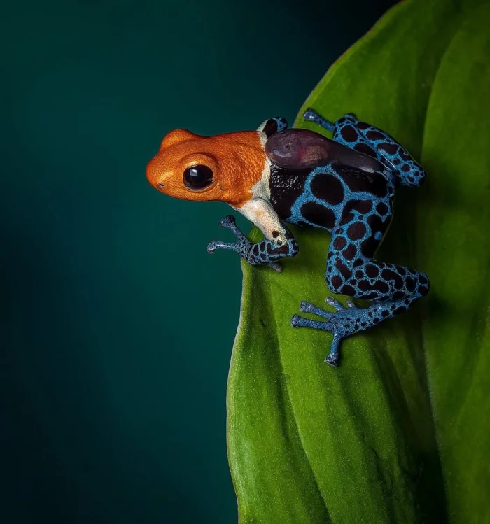 Самец красноголовой ядовитой лягушки переносит головастика на спине к небольшому водоему