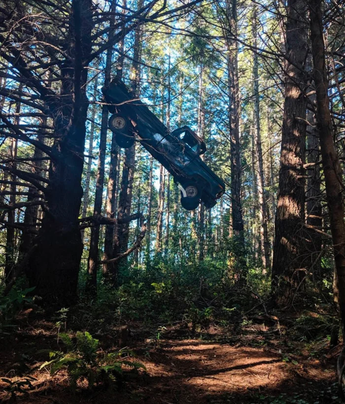 Неясно, как машина оказалась застрявшей в ветвях деревьев. Ближайшая дорога находится на расстоянии нескольких миль от этого места
