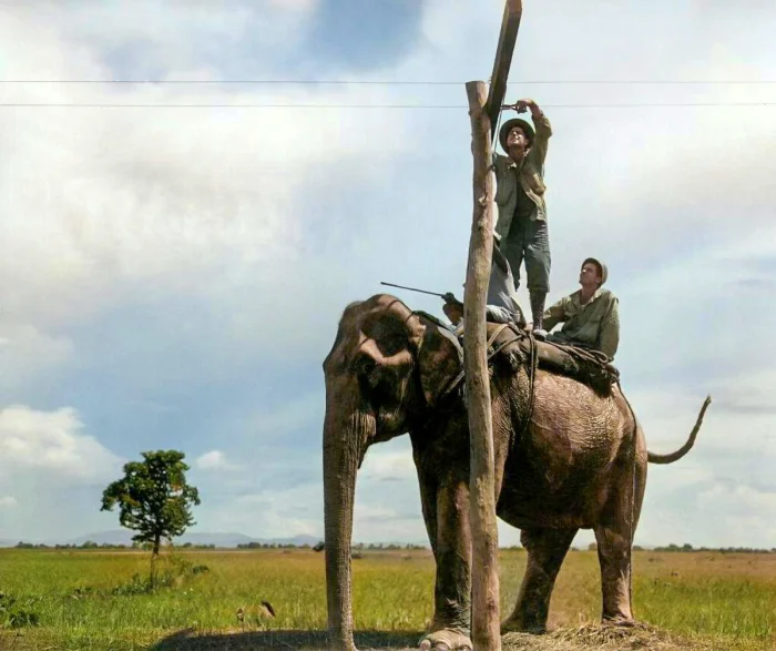 Английские связисты во время технических работ на линии связи. Район города Ассам, Индия, 1944 год.