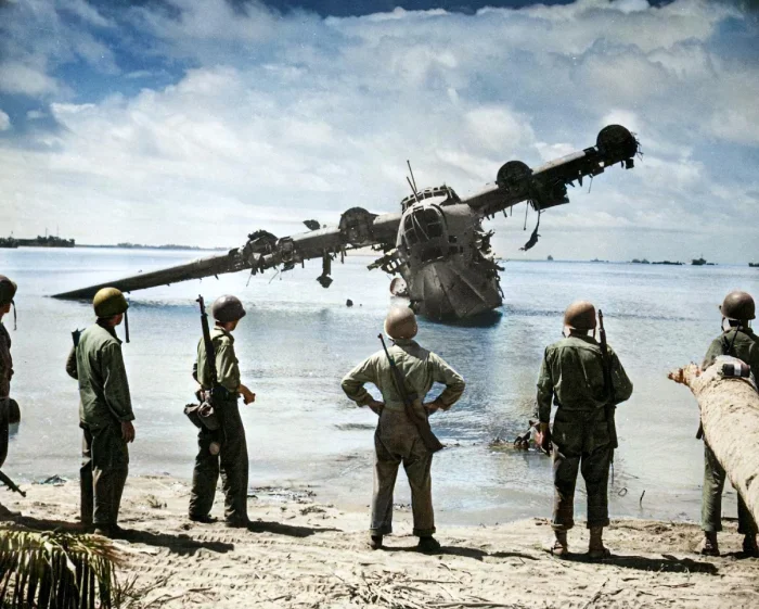 Солдаты 165-го пехотного полка 27-й пехотной дивизии армии США смотрят на разбитую японскую летающую лодку Kawanishi H8K2 на острове Бутаритари (Butaritari), атолл Макин (Makin).