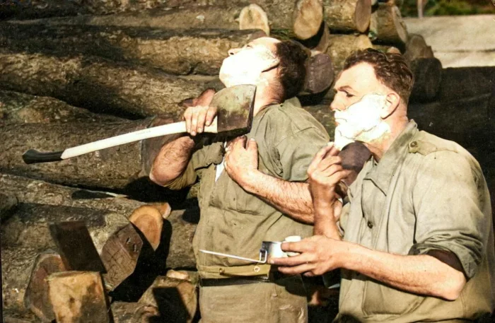 Лесной лагерь. Королевские инженеры австралийской армии сапер А. Ф. Хоббс из Квинсленда и сапер В. Х. Гулдом из Сиднея бреются топорами. Англия, 1941 год.
