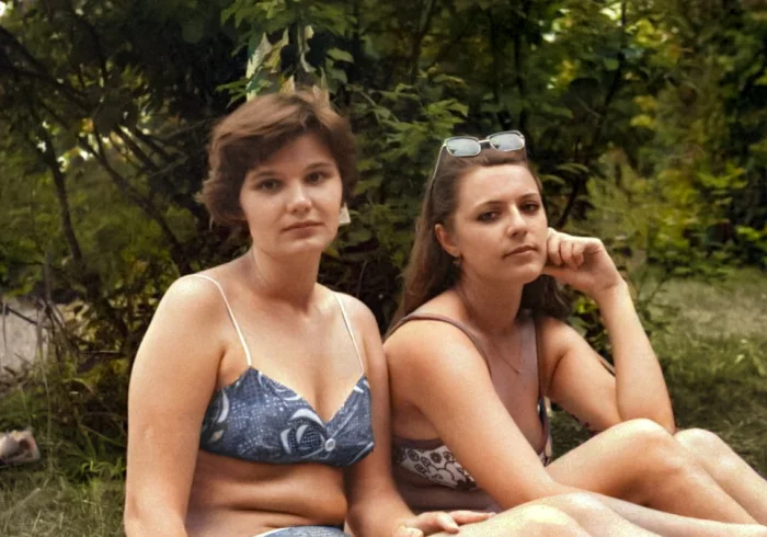 Девушки отдыхают на речном пляже. Воронеж, 1977 год.