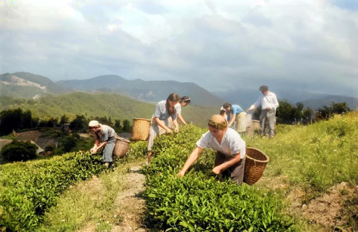 Работники колхоза «Красный путиловец» занимаются сбором зеленого листа на плантациях. Краснодарский край, Сочи - Лазаревский район, 1946 год.