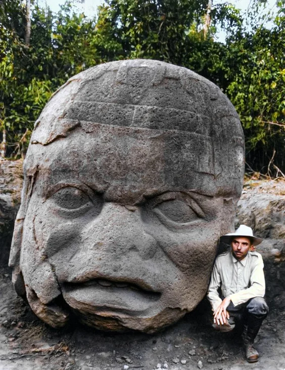 Огромная каменная голова периода ольмекской цивилизации в Мексике, 1938 год.