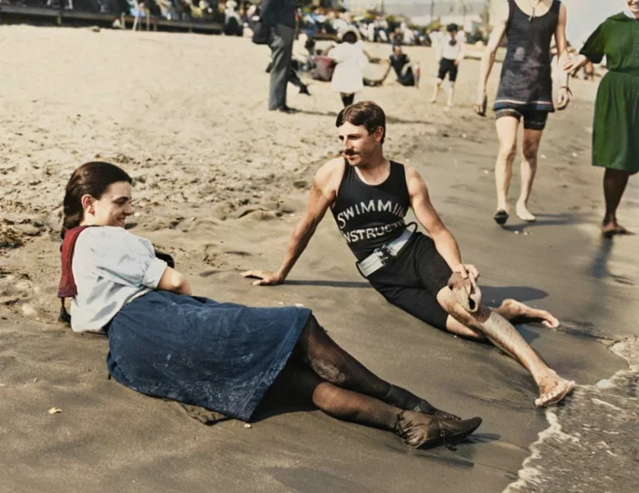 В 19 веке публичное появление в обнажённом виде считалось неприемлемым, поэтому все пользовались закрытыми купальными костюмами. Для купания использовались специальные купальные машины, которые подвозили людей к воде, позволяя им заходить в неё, не опасаясь за своё достоинство.