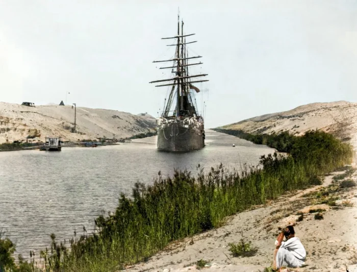 Французский фрегат проходит через Суэцкий канал, который был открыт в 1869 году.