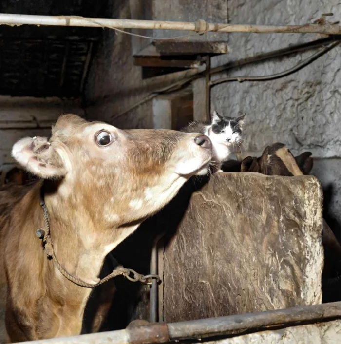 Котенок крепко подружился с коровой Дженни и любил прижиматься к ней, когда она спала. У Дженни также появилась привычка облизывать маленького котенка, что также нравилось котенку. Теперь маленький котенок привык сидеть на стене загона Дженни.