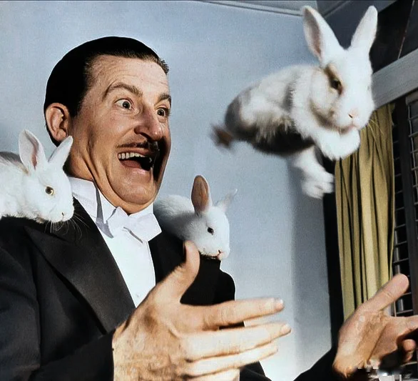 Жонглер Бен Бери жонглирует кроликами. Лос-Анджелес, Калифорния, 1950 год.
