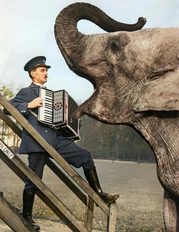 Смотритель зоопарка играет на аккордеоне для слона, 1950-е.