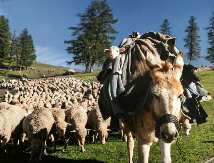 Маленький ягненок верхом на осле, за которым следует стадо овец во время перегона скота, 1958 год.