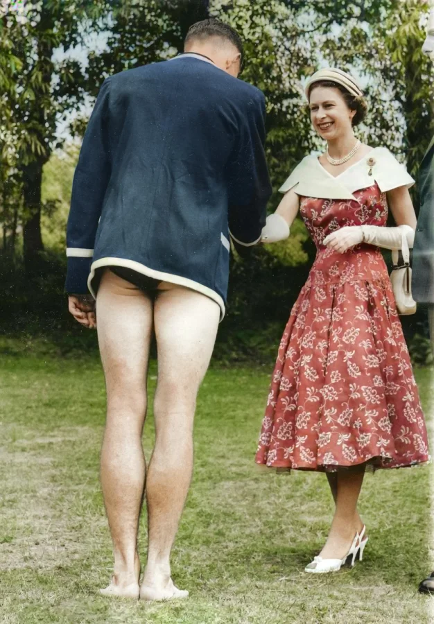 Королева Елизавета II во время визита в Mill Hill School приветствует капитана сборной по плаванию Д.Г. Оуэна, 1957 год.