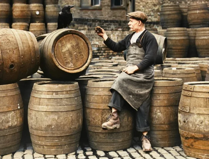 Пивовар и его ручной ворон на пивоварне в Лондоне, 1934 год.