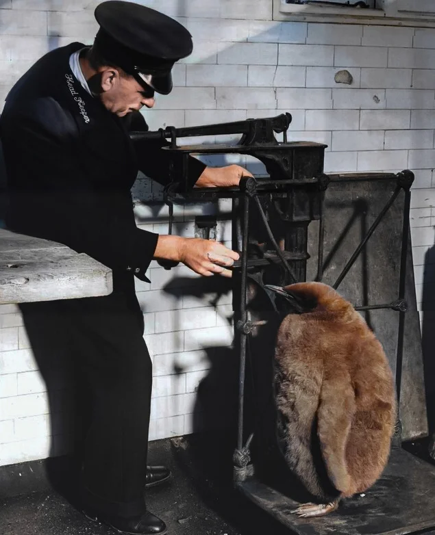Смотритель Герберт Джонс взвешивает детеныша королевского пингвина в Лондонском зоопарке, 1952 год.