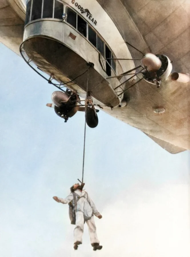 Известный американский акробат, прикрепленный к летящему дирижаблю на веревке на высоте 1000 метров.