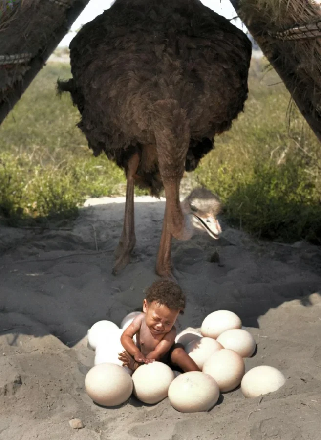 Ребёнок в Оудсхорне, Капская провинция, Южная Африка, сидит на куче страусиных яиц, 1939 год.