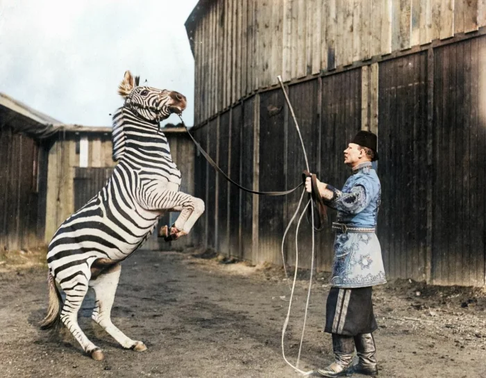 Артист цирка обучает зебру стоять на задних копытах, 1920 год.