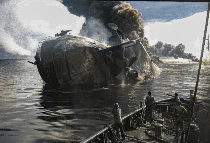 Тонущий танкер ВМС США USS "Mississinewa", пораженный управляемой торпедой "Кайтэн". Атолл Улити, ноябрь 1944 года.